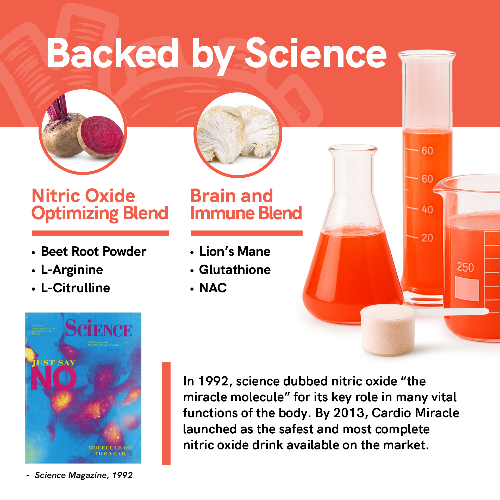 It would take an entire cupboard to hold all the quality ingredients Cardio Miracle packs into one serving! By premixing quality ingredients for you into an easy-to-use powder, you can achieve the healthy outcomes associated with nitric oxide. You would need 80 capsules for the same ingredients, but still wouldn’t achieve the bioavailability and absorbability that make Cardio Miracle effective. We are the fastest way to increase nitric oxide in your body.